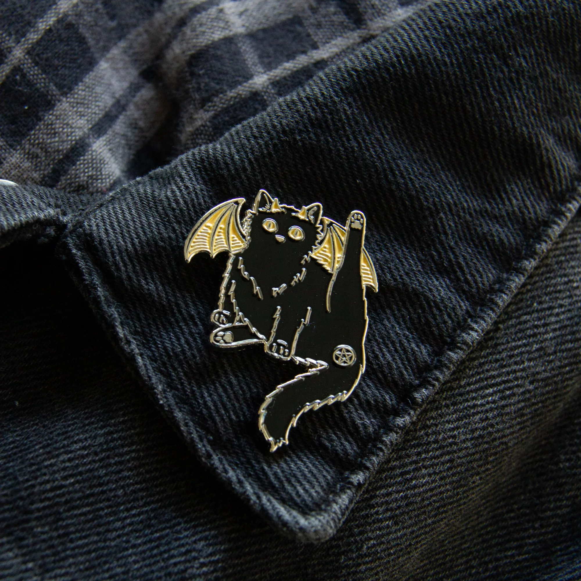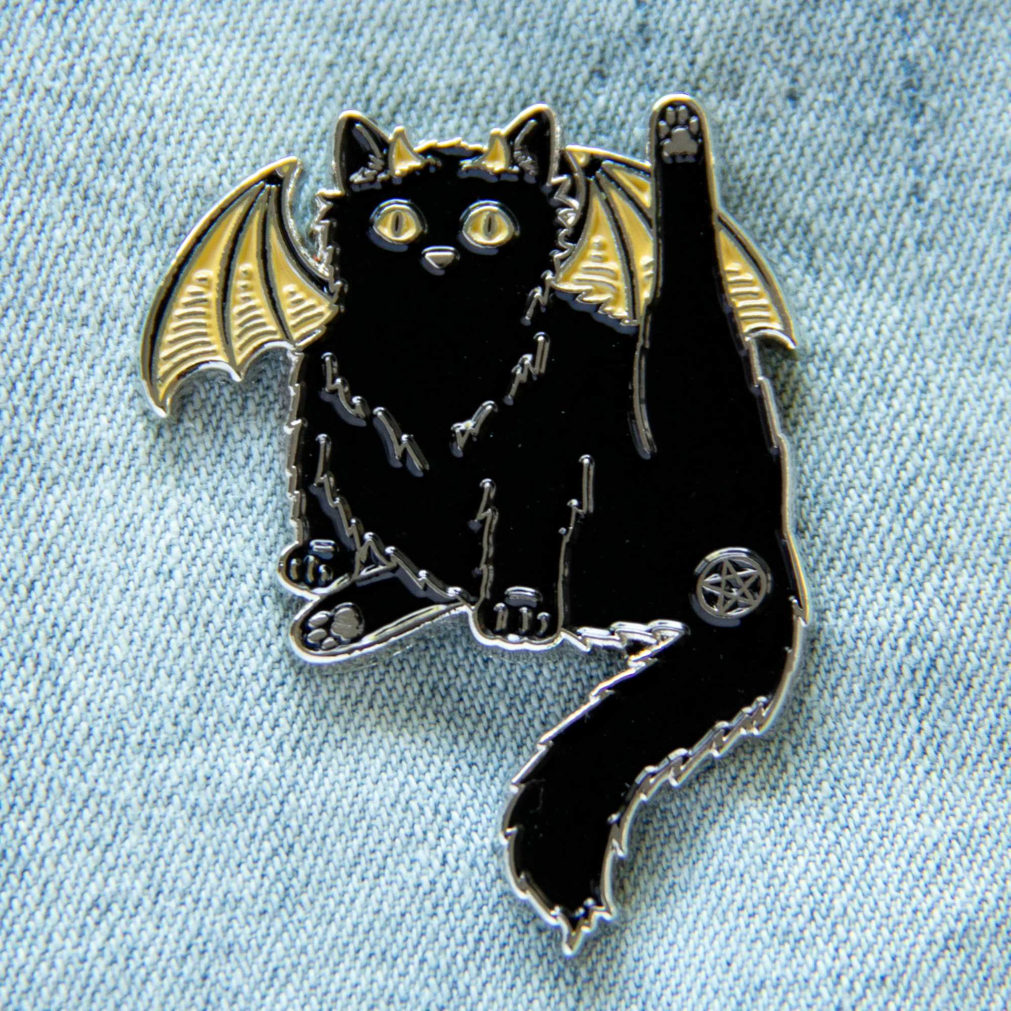 Meet your new mischievous accessory — the Pentacle Black Cat Enamel Pin. This tiny winged troublemaker is designed to sit proudly on your vest, jacket, backpack, or lapel. Featuring a black cat cheekily lifting its leg to reveal a pentacle detail, it blends spooky charm with irresistible cuteness.