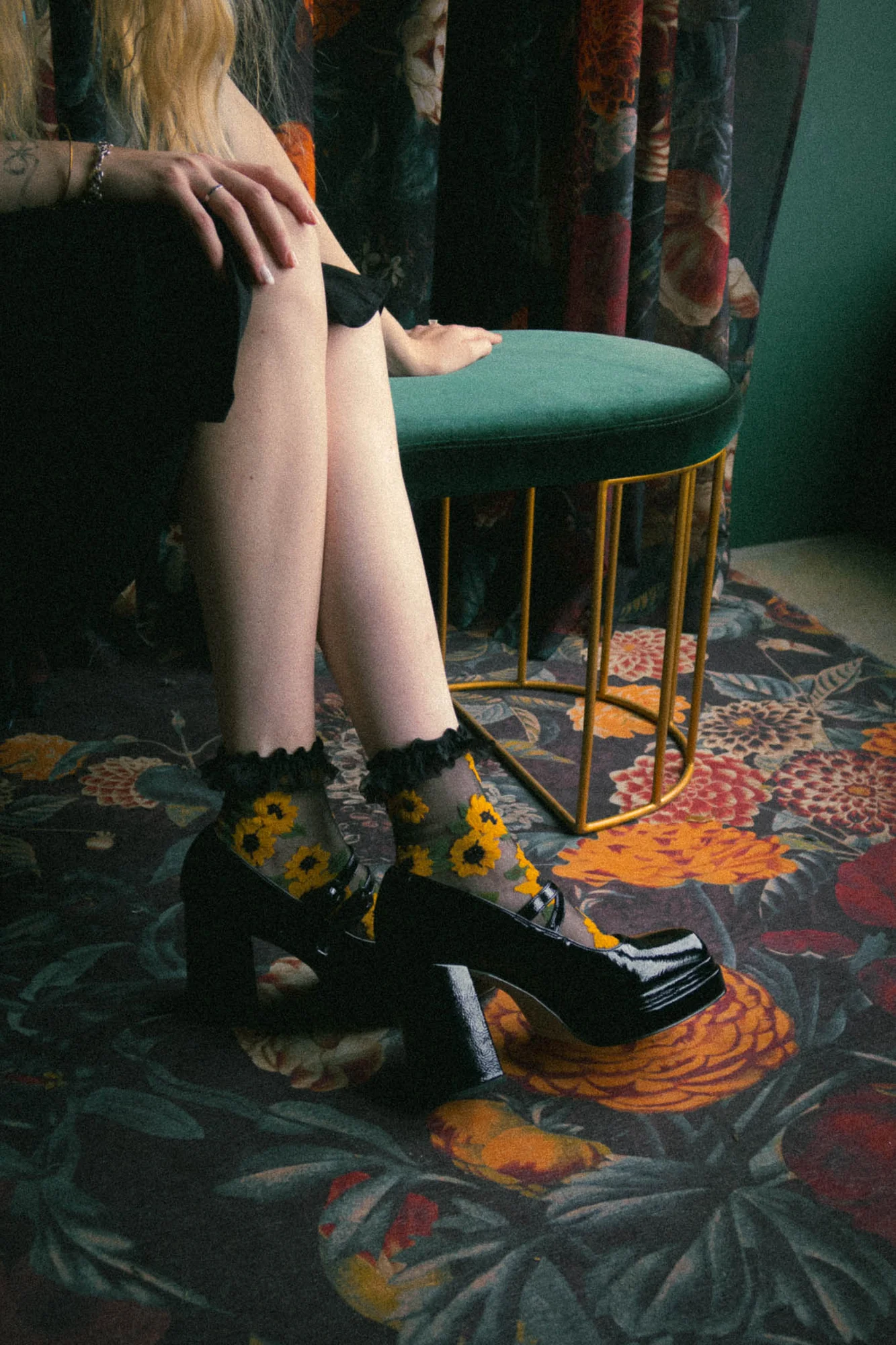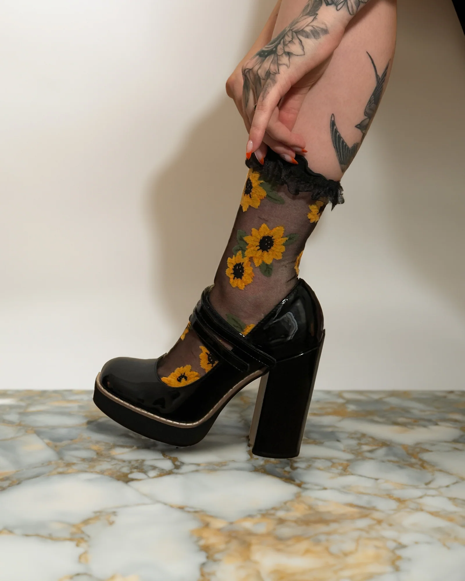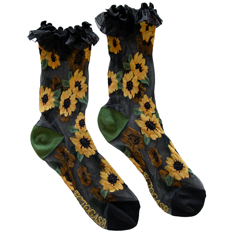 Add a touch of whimsy to your wardrobe with these enchanting Sheer Sunflower Socks. Crafted from delicate black mesh and adorned with blooming sunflower motifs, this pair brings playful elegance to every outfit.