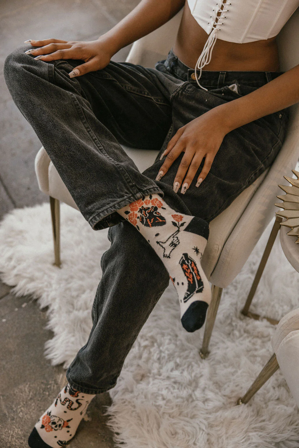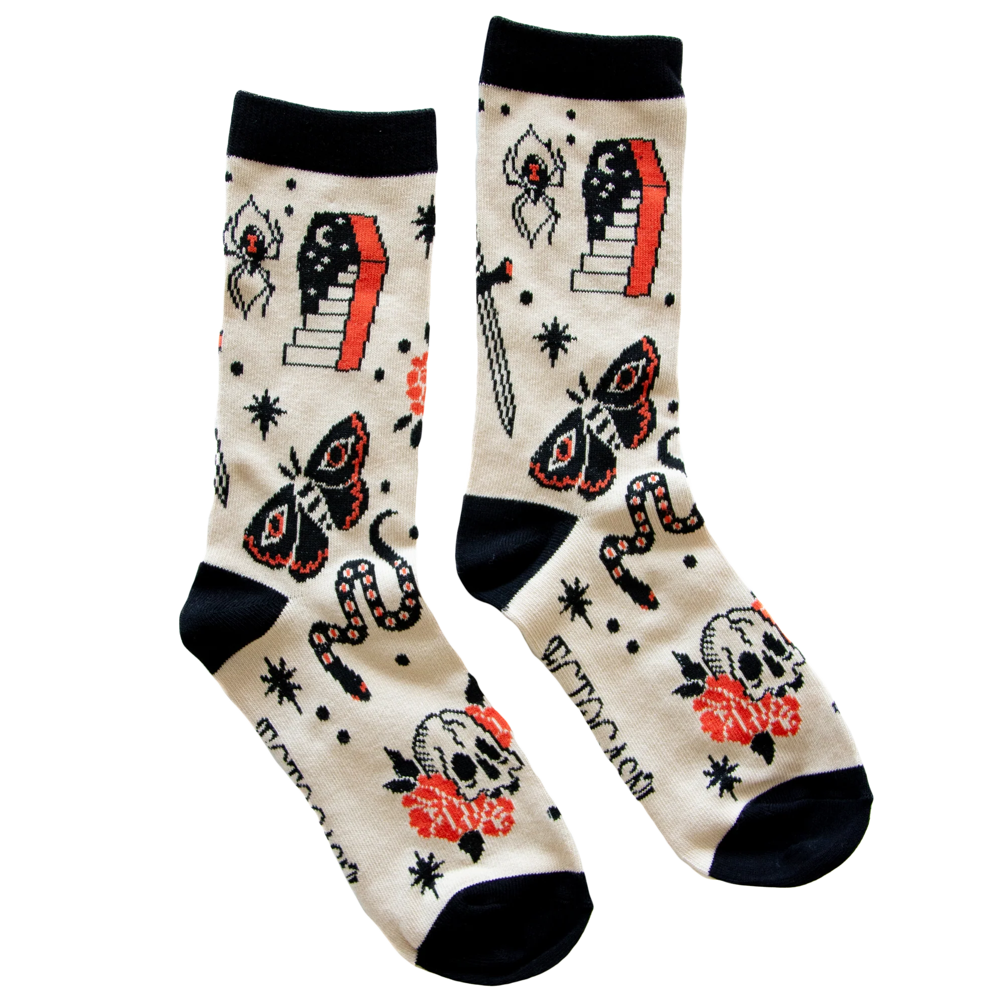 Step up your sock game with this edgy pair inspired by classic tattoo flash art. Featuring woven illustrations of spiders, snakes, skulls, roses, and more — these bold socks bring attitude, originality, and a hint of rebellion to every outfit.